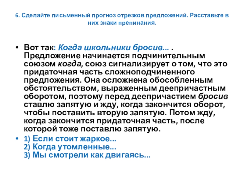 Слайд 196. Сделайте письменный прогноз отрезков предложений. Расставьте в них знаки препинания.