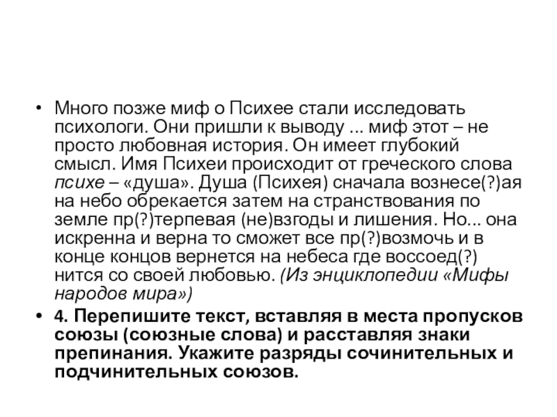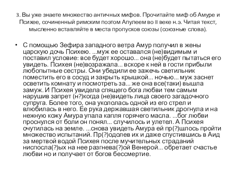 и Психее, сочиненный римским поэтом Апулеем во II веке н.э. Читая текст, мысленно вставляйте в места пропусков союзы (союзные слова).
