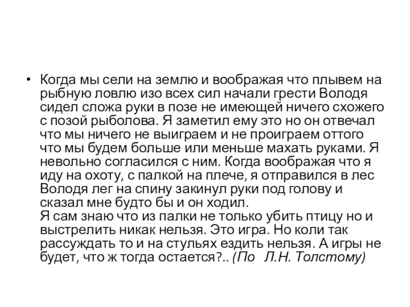 Я сам знаю что из палки не только убить птицу но и выстрелить никак нельзя. Это игра. Но коли так рассуждать то и на стульях ездить нельзя. А игры не будет, что ж тогда остается?.. (По Л.Н. Толстому)