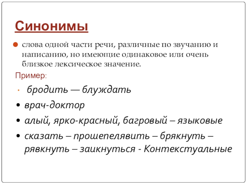 слова одной части речи, различные по звучанию и написанию, имеющие прямо