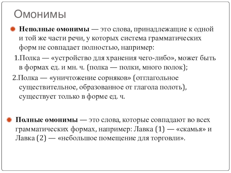 Полные омонимы — это слова, которые совпадают во всех грамматических формах, например: Лавка (1) — «скамья» и Лавка (2) — «небольшое помещение для торговли».