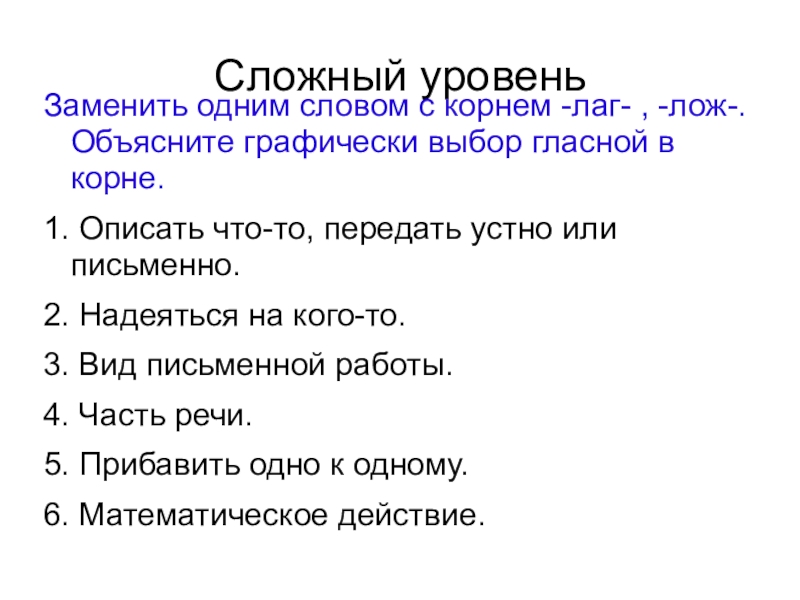 Слайд 1Правописание гласных букв о-а в чередующихся корнях-лаг- -лож-