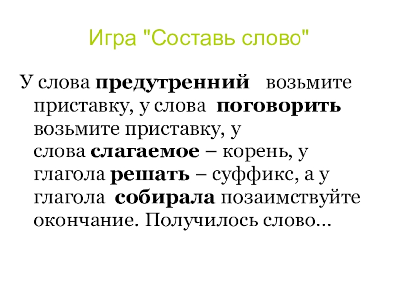 возьмите приставку, у слова слагаемое – корень, у глагола решать – суффикс, а у глагола собирала позаимствуйте окончание. Получилось слово…