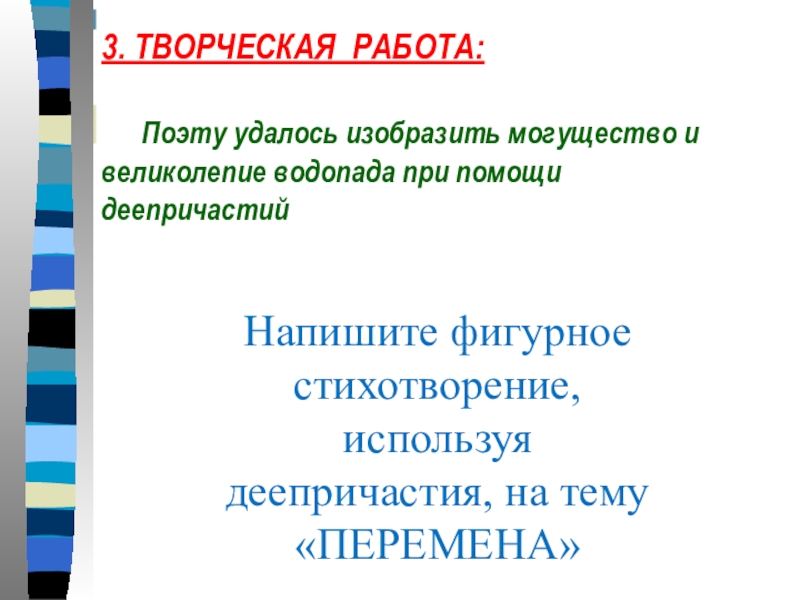 Напишите фигурное стихотворение, используя деепричастия, на тему «ПЕРЕМЕНА»