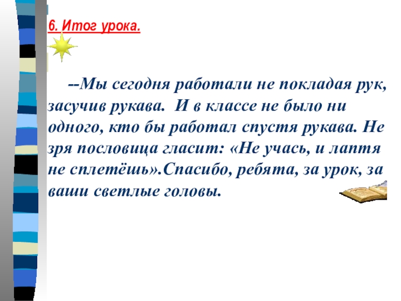 в классе не было ни одного, кто бы работал спустя рукава. Не зря пословица гласит: «Не учась, и лаптя не сплетёшь».Спасибо, ребята, за урок, за ваши светлые головы.