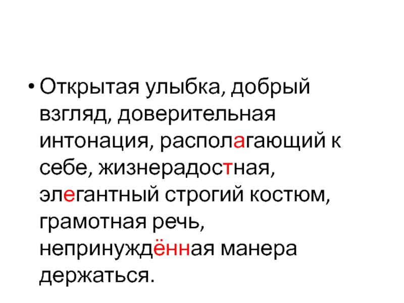 Слайд 10Открытая улыбка, добрый взгляд, доверительная интонация, располагающий к себе, жизнерадостная, элегантный