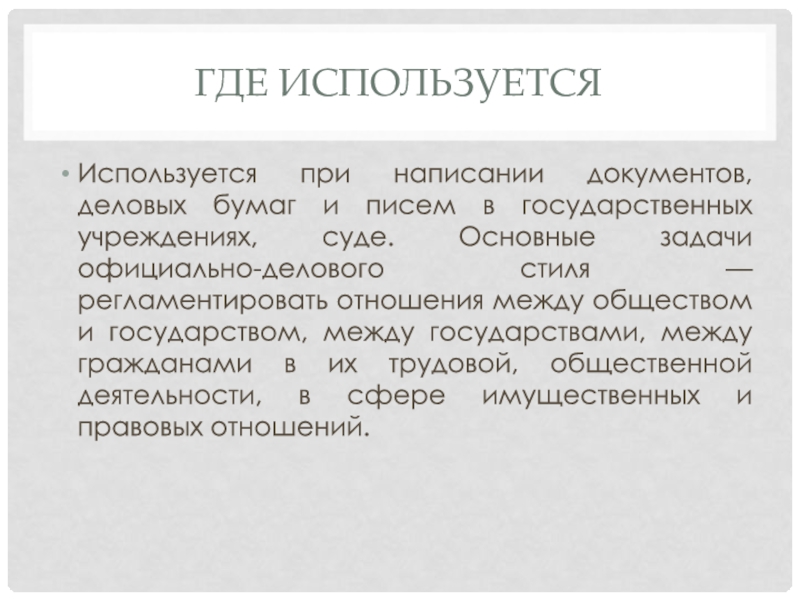 учреждениях, суде. Основные задачи официально-делового стиля — регламентировать отношения между обществом и государством, между государствами, между гражданами в их трудовой, общественной деятельности, в сфере имущественных и правовых отношений.