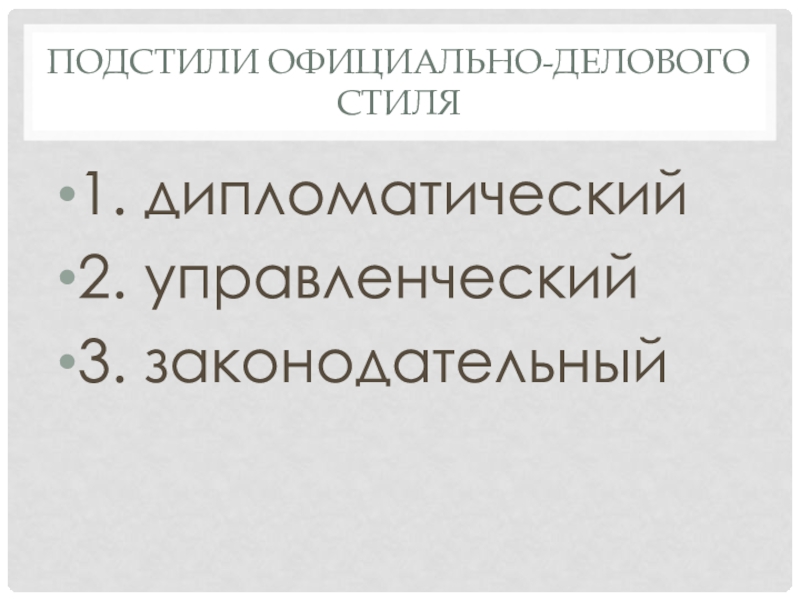 Дипломатический подстиль встречается в дипломатических документах таких, каккоммюнике, дипломатическая нота,