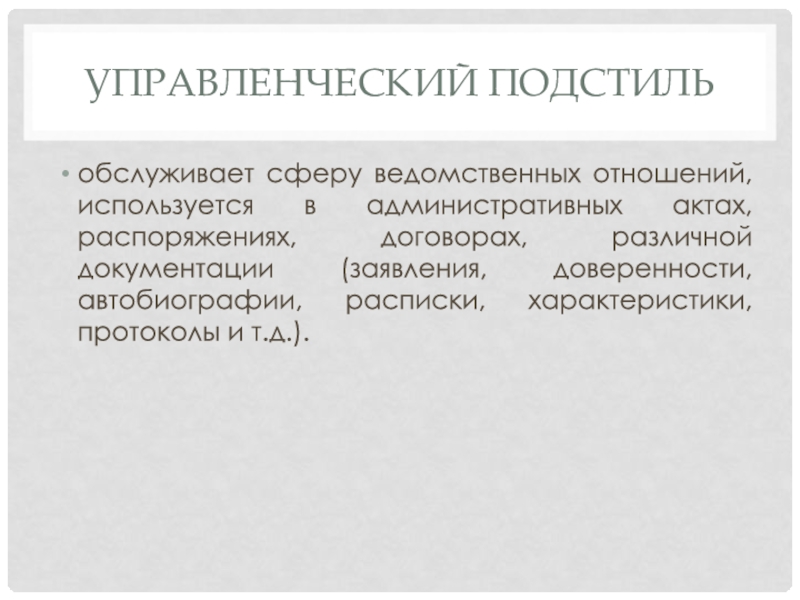 обслуживает сферу ведомственных отношений, используется в административных актах, распоряжениях, договорах,