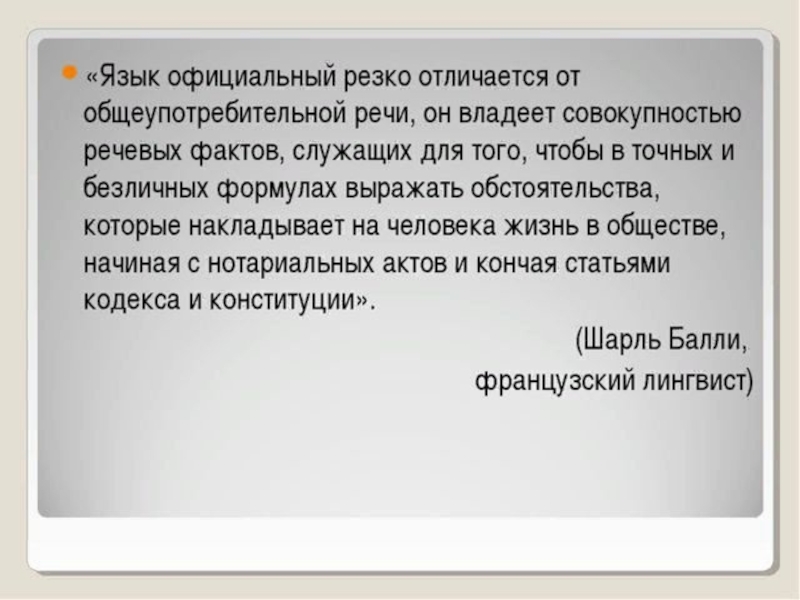 Язык законов отличается иным стилистическим оформлением: он всегда должен быть прост и краток, главное в нем – точность выражения мысли, не допускающая инотолкования. Четкость и точность формулировок здесь абсолютно необходимы, так как законы рассчитаны на однозначность восприятия, они не должны быть истолкованы по-разному.
