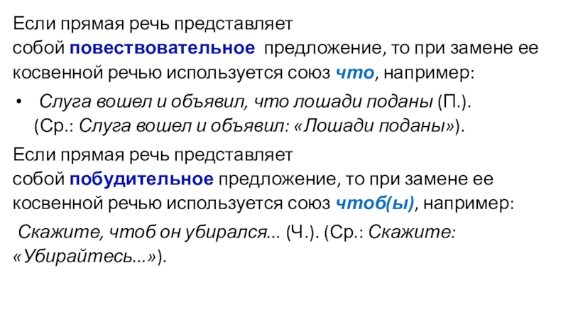 Слуга вошел и объявил, что лошади поданы (П.). (Ср.: Слуга вошел и объявил: «Лошади поданы»).