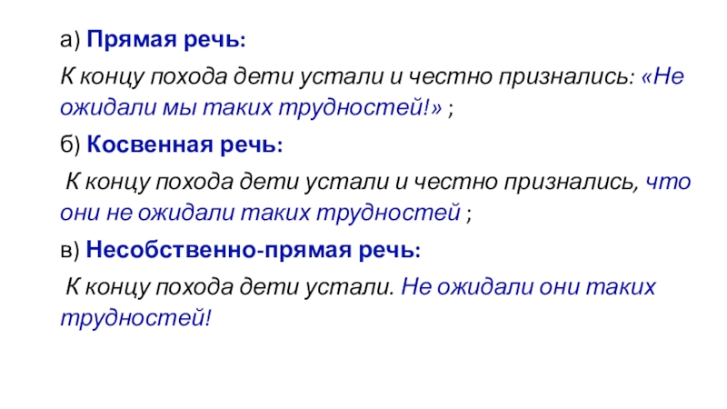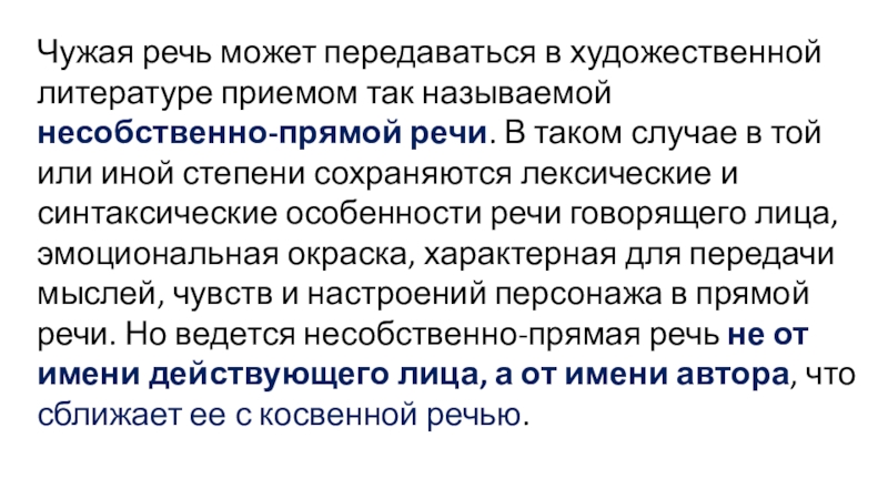 В таком случае в той или иной степени сохраняются лексические и синтаксические особенности речи говорящего лица, эмоциональная окраска, характерная для передачи мыслей, чувств и настроений персонажа в прямой речи. Но ведется несобственно-прямая речь не от имени действующего лица, а от имени автора, что сближает ее с косвенной речью.