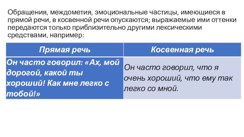 Обращения, междометия, эмоциональные частицы, имеющиеся в прямой речи, в косвенной речи