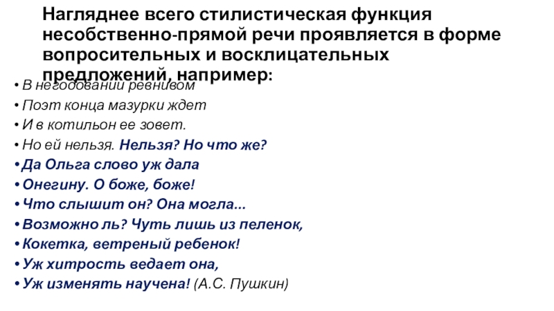 Нагляднее всего стилистическая функция несобственно-прямой речи проявляется в форме вопросительных и