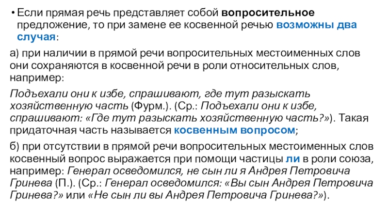 б) при отсутствии в прямой речи вопросительных местоименных слов косвенный вопрос выражается при помощи частицы ли в роли союза, например: Генерал осведомился, не сын ли я Андрея Петровича Гринева (П.). (Ср.: Генерал осведомился: «Вы сын Андрея Петровича Гринева?» или «Не сын ли вы Андрея Петровича Гринева?»).