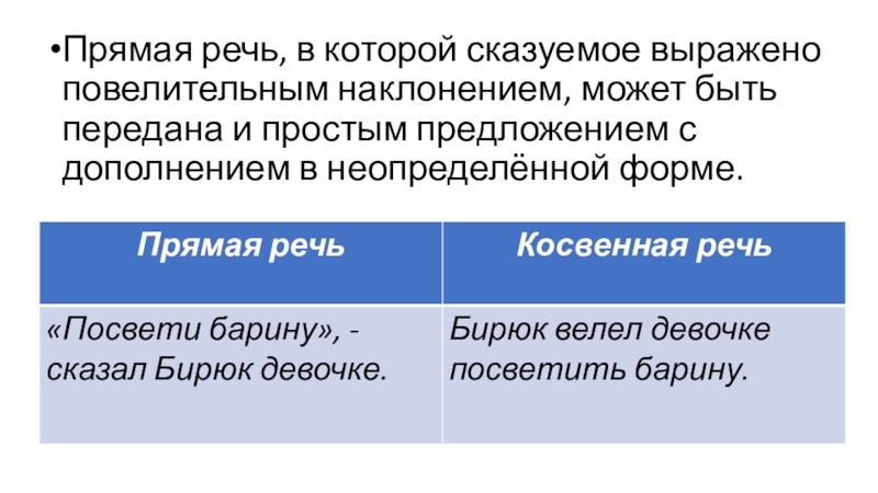 Слайд 8Прямая речь, в которой сказуемое выражено повелительным наклонением, может быть передана
