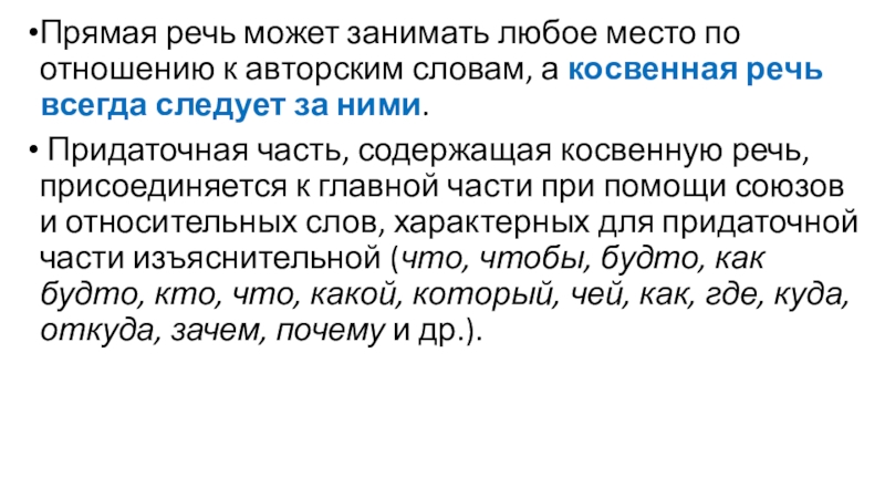 Слайд 3Прямая речь может занимать любое место по отношению к авторским словам,