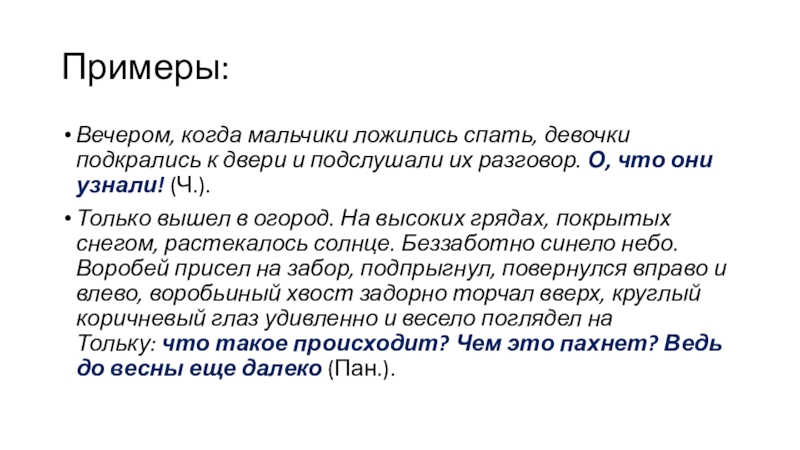 Только вышел в огород. На высоких грядах, покрытых снегом, растекалось солнце. Беззаботно синело небо. Воробей присел на забор, подпрыгнул, повернулся вправо и влево, воробьиный хвост задорно торчал вверх, круглый коричневый глаз удивленно и весело поглядел на Тольку: что такое происходит? Чем это пахнет? Ведь до весны еще далеко (Пан.).
