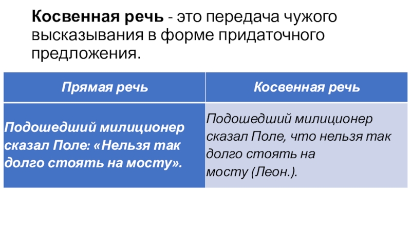 Слайд 2Косвенная речь - это передача чужого высказывания в форме придаточного предложения.