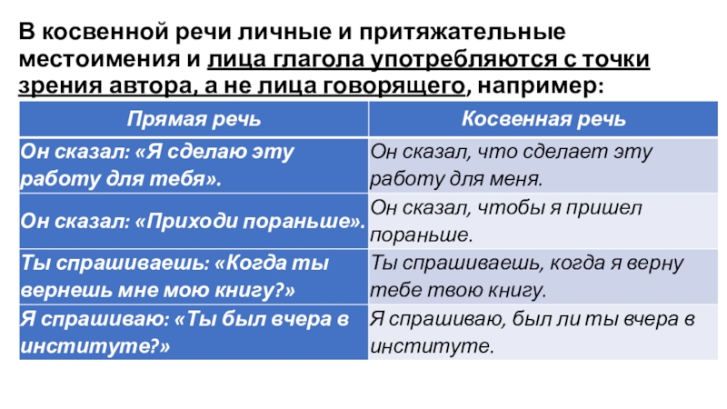 В косвенной речи личные и притяжательные местоимения и лица глагола употребляются