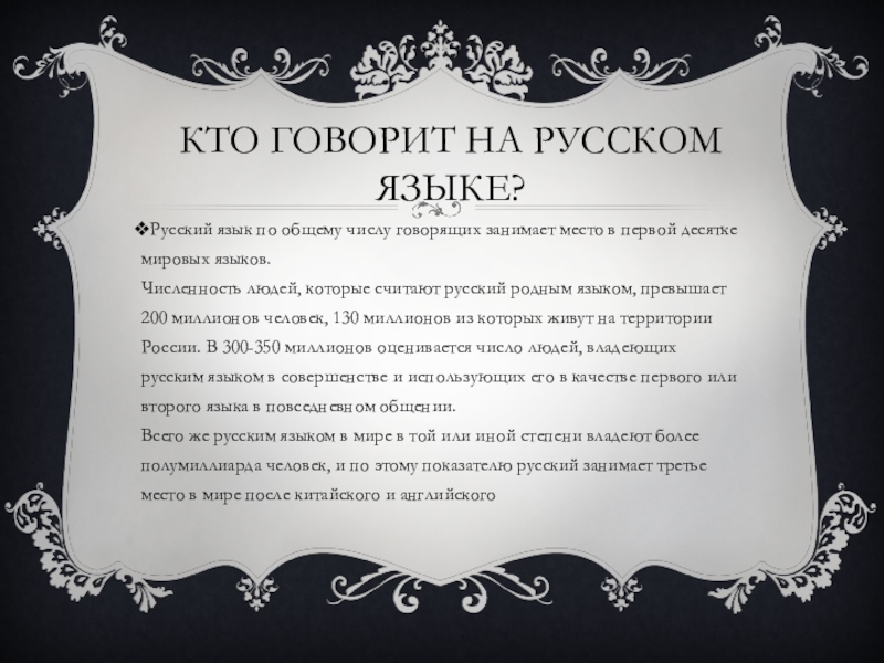Численность людей, которые считают русский родным языком, превышает 200 миллионов человек, 130 миллионов из которых живут на территории России. В 300-350 миллионов оценивается число людей, владеющих русским языком в совершенстве и использующих его в качестве первого или второго языка в повседневном общении.