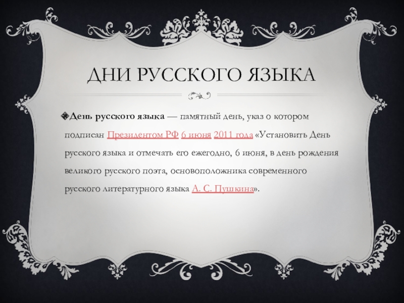 РФ 6 июня 2011 года «Установить День русского языка и отмечать его ежегодно, 6 июня, в день рождения великого русского поэта, основоположника современного русского литературного языка А. С. Пушкина».