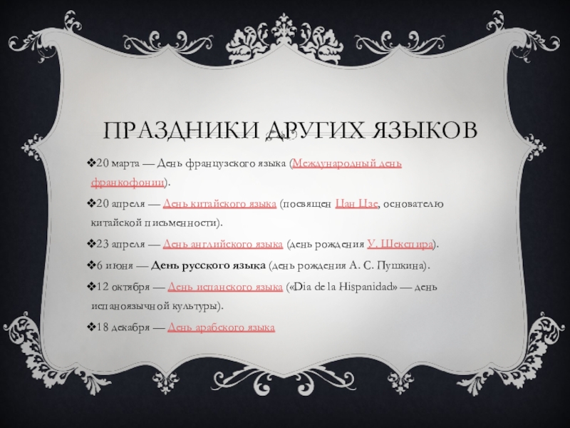 12 октября — День испанского языка («Dia de la Hispanidad» — день испаноязычной культуры).