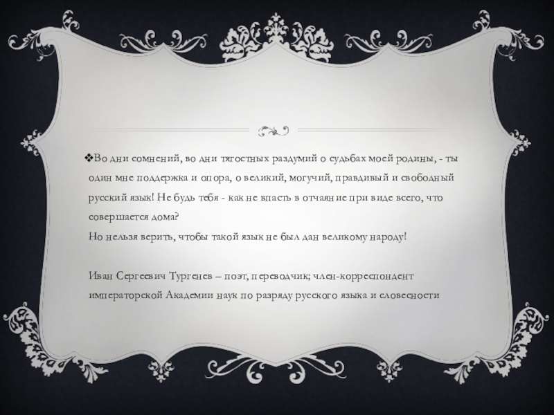 - ты один мне поддержка и опора, о великий, могучий, правдивый и свободный русский язык! Не будь тебя - как не впасть в отчаяние при виде всего, что совершается дома?