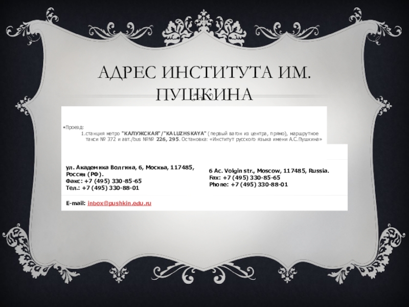 № 372 и авт./bus №№ 226, 295. Остановка: «Институт русского языка имени А.С.Пушкина»