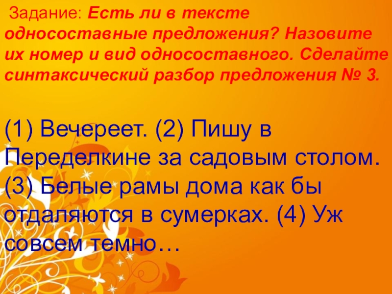 Слайд 19 Задание: Есть ли в тексте односоставные предложения? Назовите их номер