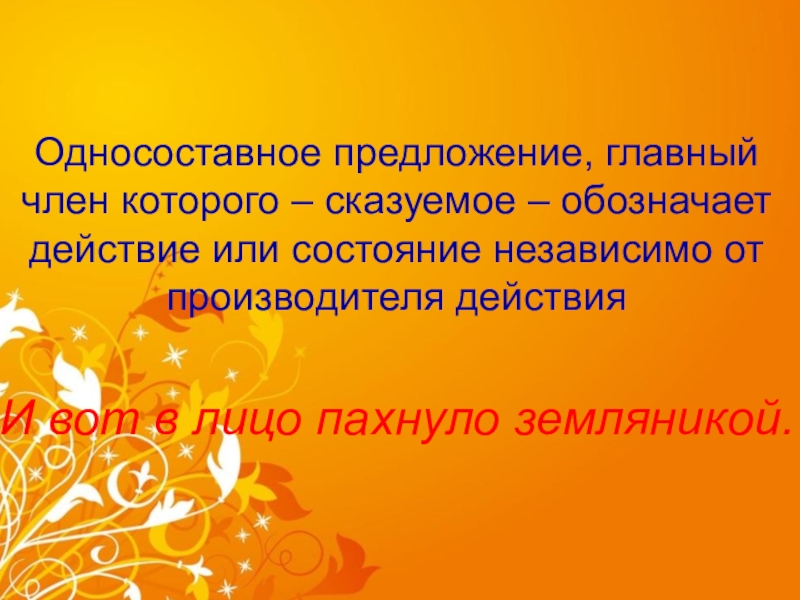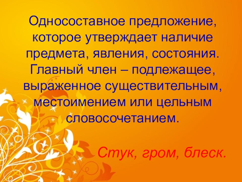 Слайд 11Односоставное предложение, которое утверждает наличие предмета, явления, состояния. Главный член –