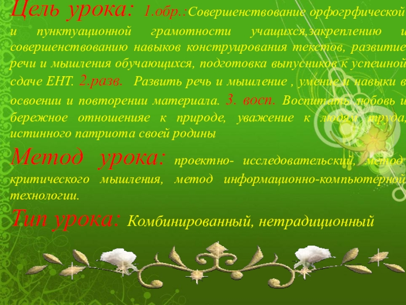 конструирования текстов, развитие речи и мышления обучающихся, подготовка выпусников к успешной сдаче ЕНТ. 2.разв. Развить речь и мышление , умение и навыки в освоении и повторении материала. 3. восп. Воспитать любовь и бережное отношенияе к природе, уважение к людям труда,истинного патриота своей родины