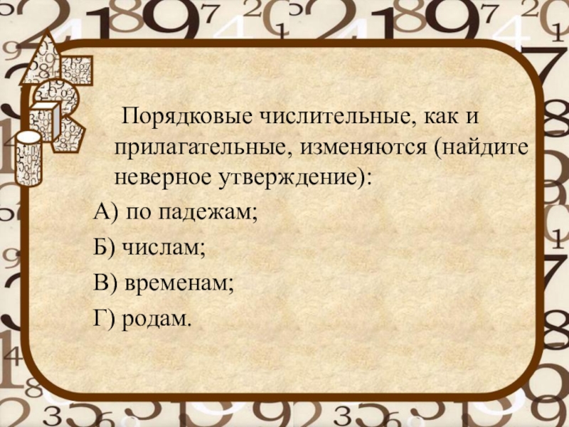 Слайд 6 Порядковые числительные, как и прилагательные, изменяются (найдите неверное утверждение):
