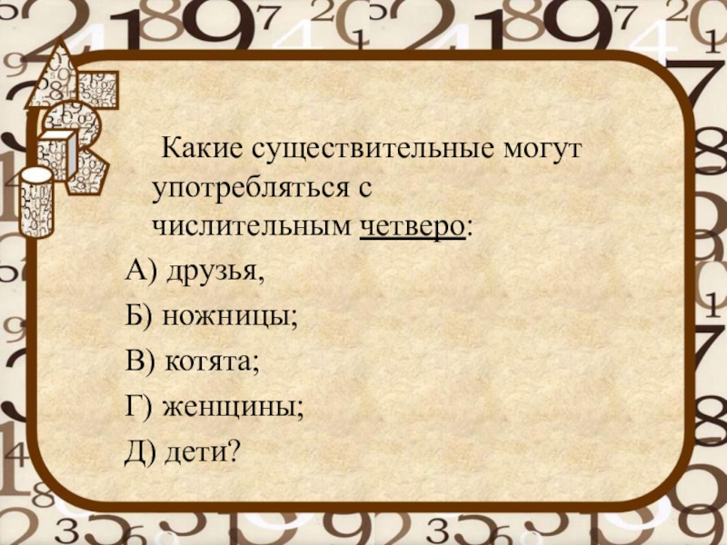 Слайд 10 Какие существительные могут употребляться с числительным четверо: