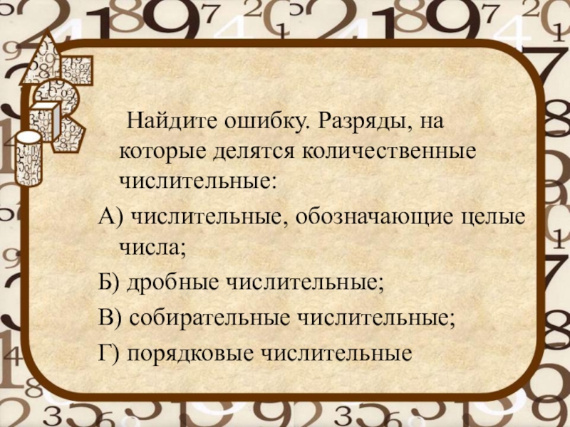 Слайд 5 Найдите ошибку. Разряды, на которые делятся количественные числительные: