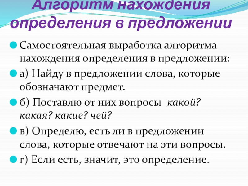 Алгоритм нахождения определения в предложении Самостоятельная выработка алгоритма нахождения определения в предложении:а) Найду в предложении слова,