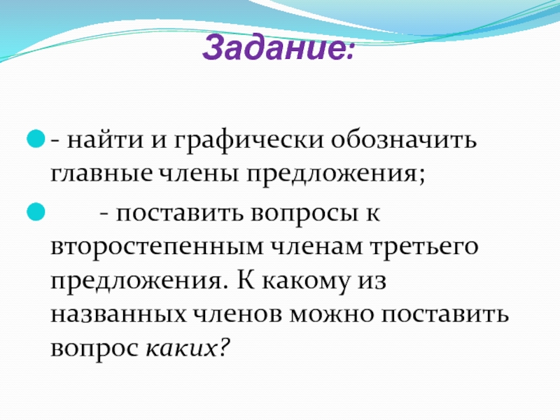 Задание: - найти и графически обозначить главные члены предложения;    - поставить вопросы к второстепенным