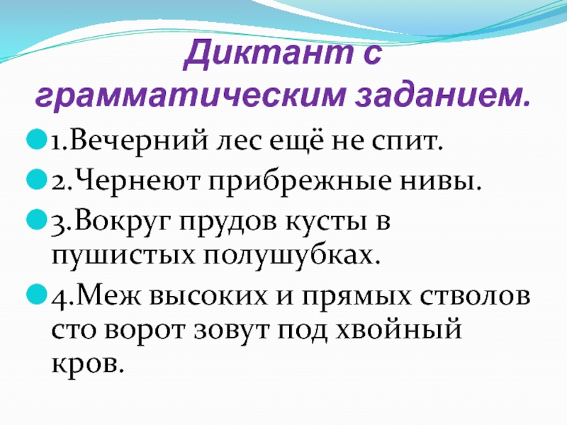 Диктант с грамматическим заданием.1.Вечерний лес ещё не спит.2.Чернеют прибрежные нивы.3.Вокруг прудов кусты в пушистых полушубках.4.Меж высоких и