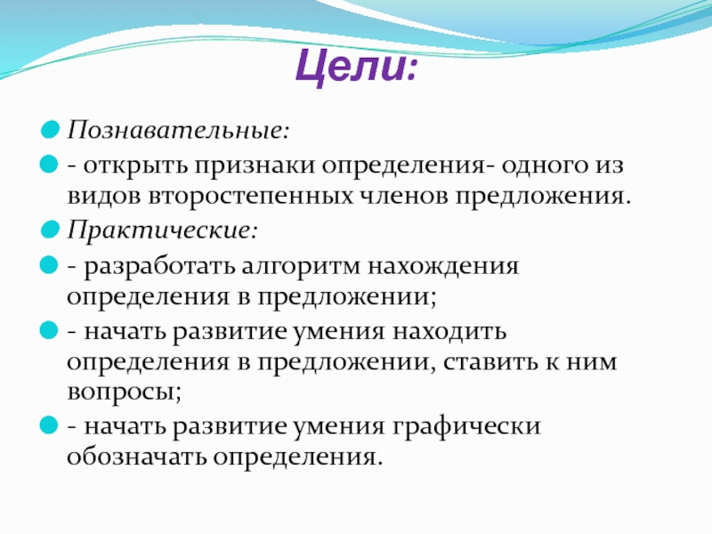 Цели: Познавательные:- открыть признаки определения- одного из видов второстепенных членов предложения.Практические:- разработать алгоритм нахождения определения в предложении;- начать развитие умения находить определения в предложении, ставить к ним вопросы;- начать развитие умения графически обозначать определения.