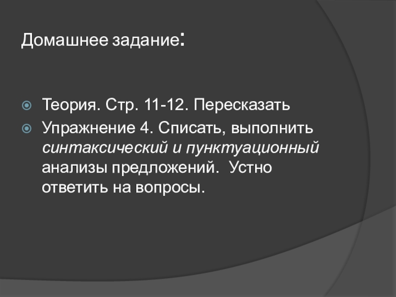 Домашнее задание:Теория. Стр. 11-12. ПересказатьУпражнение 4. Списать, выполнить синтаксический и пунктуационный анализы предложений. Устно ответить на вопросы.