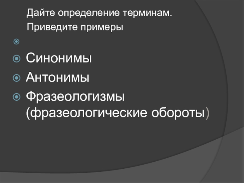 Дайте определение терминам.   Приведите примеры СинонимыАнтонимыФразеологизмы (фразеологические обороты)