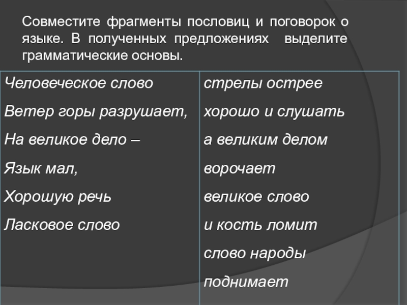 Совместите фрагменты пословиц и поговорок о языке. В полученных предложениях выделите грамматические основы.