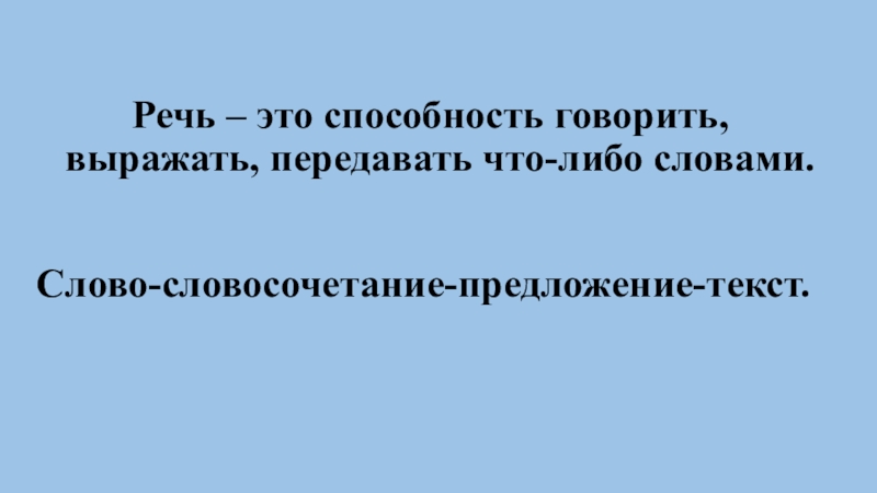 Речь – это способность говорить,   выражать, передавать что-либо словами.Слово-словосочетание-предложение-текст.