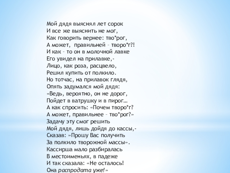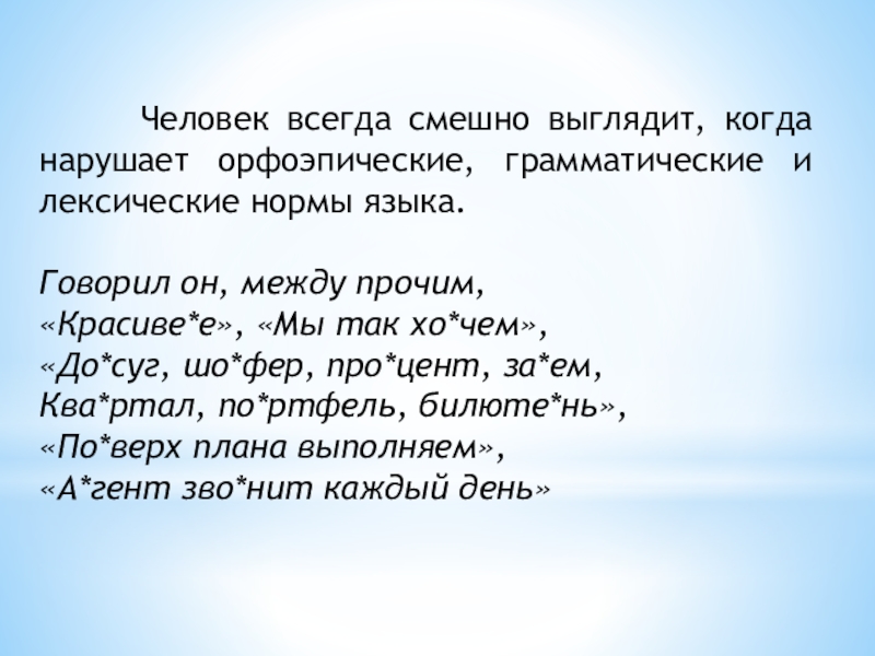 Слайд 10 Человек всегда смешно выглядит, когда нарушает орфоэпические, грамматические