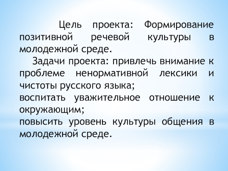 Задачи проекта: привлечь внимание к проблеме ненормативной лексики и чистоты русского языка;