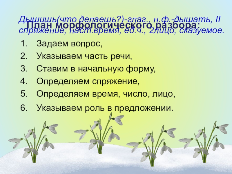 Дышишь(что делаешь?)-глаг., н.ф.-дышать, II спряжение, наст.время, ед.ч., 2лицо, сказуемое.