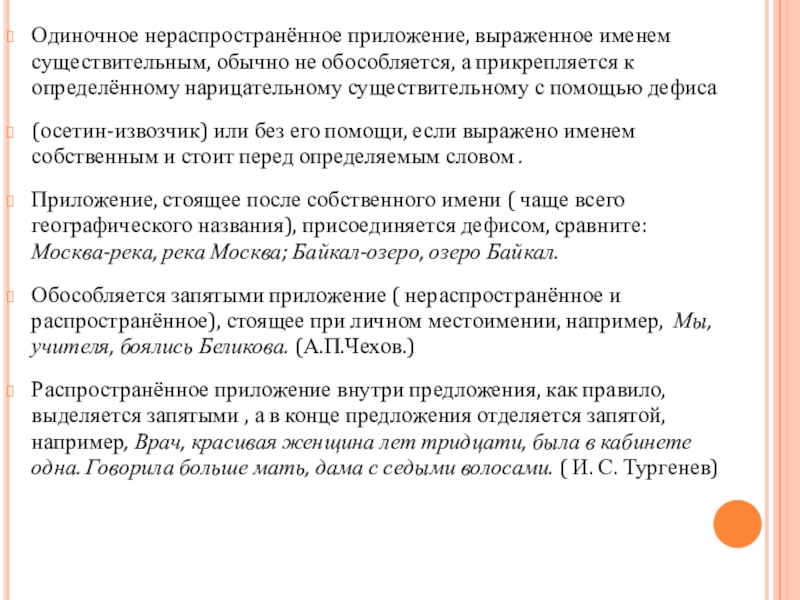 1. Мне как механику выполнить это ничего не стоит (Н. П.). 2. Он считал, что из Вани выйдет художник-ботаник или, как он выражался, «флорист» (Пауст.). 3. Он приветливо смотрел на Сергея, которого знал уже как активного и сознательного хорошо грамотного бойца (Кетл.). 4. Я чувствую, что нашему брату господам не совсем прилично смеяться над Поликеем (Л. Т.). 5. В моей деревне, что стоит высоко, есть озеро по имени Кайдор всё в звёздах лилий и в кудрях осоки (Фед.). 6. Человек до дна прозрачный стойкий и верный она хотела, чтобы и все вокруг были такими (Наг.). 7. Я Зотов Семён Васильевич заявляю, что выведенный мною новый сорт ячменя « шестигранного» я передаю в полное распоряжение совхозу на благо нашей великой Родины(Сол.). 8. И за всей вокруг пальбою за разрывами в дыму он следит владыка боя и решает, что к чему (Тв.). 9. Фронтовой бродяга газетчик я в любом блиндаже родня (Сур.). 10. Несколько особняком держался только молодой писатель волгарь из города Вольска Александр Яковлев (Пауст.).