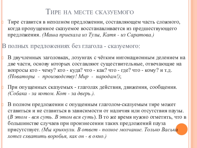 При опущенных сказуемых - глаголах действия, движения, сообщения. (Собака - за котом. Кот - за дверь.).