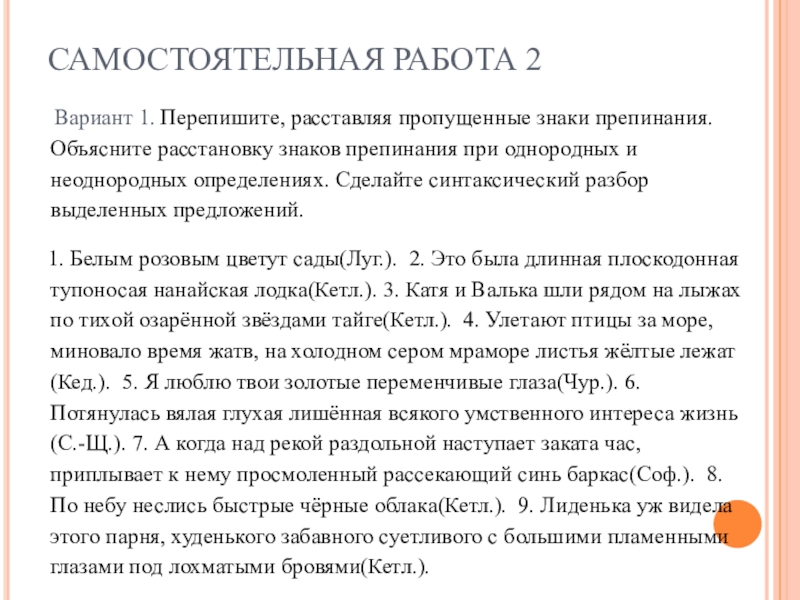 1. Белым, розовым цветут сады (Луг.). 2. Это была длинная плоскодонная тупоносая нанайская лодка (Кетл.). 3. Катя и Валька шли рядом на лыжах по тихой, озарённой звёздами тайге (Кетл.). 4. Улетают птицы за море, миновало время жатв, на холодном сером мраморе листья жёлтые лежат (Кед.). 5. Я люблю твои золотые, переменчивые глаза (Чур.). 6. Потянулась вялая, глухая, лишённая всякого умственного интереса жизнь (С.-Щ.). 7. А когда над рекой раздольной наступает заката час, приплывает к нему просмоленный, рассекающий синь баркас (Соф.). 8. По небу неслись быстрые чёрные облака (Кетл.). 9. Лиденька уж видела этого парня, худенького, забавного, суетливого, с большими пламенными глазами под лохматыми бровями (Кетл.).