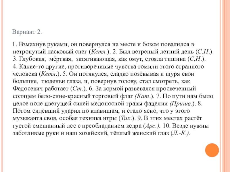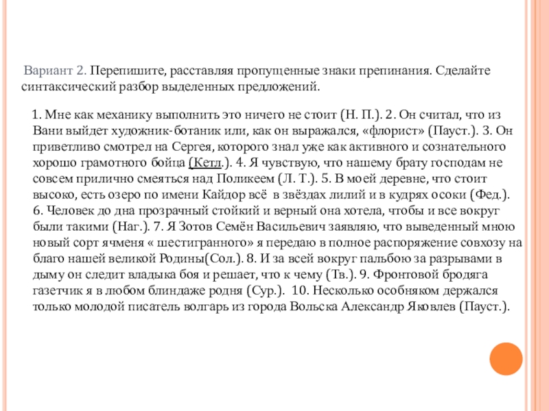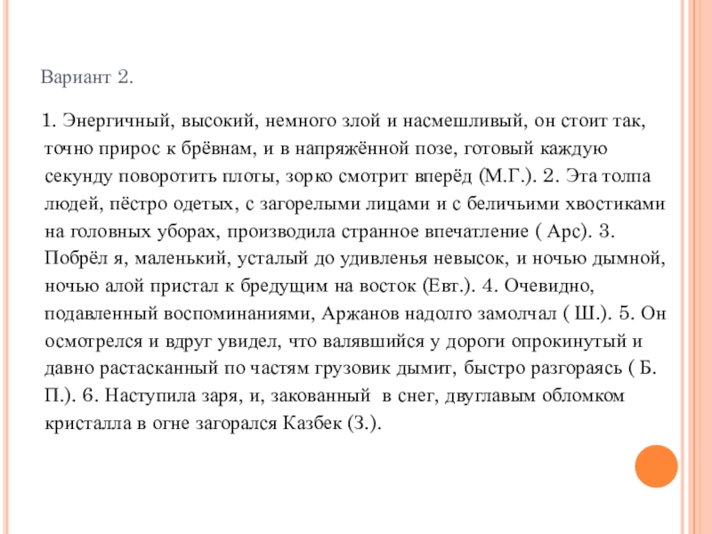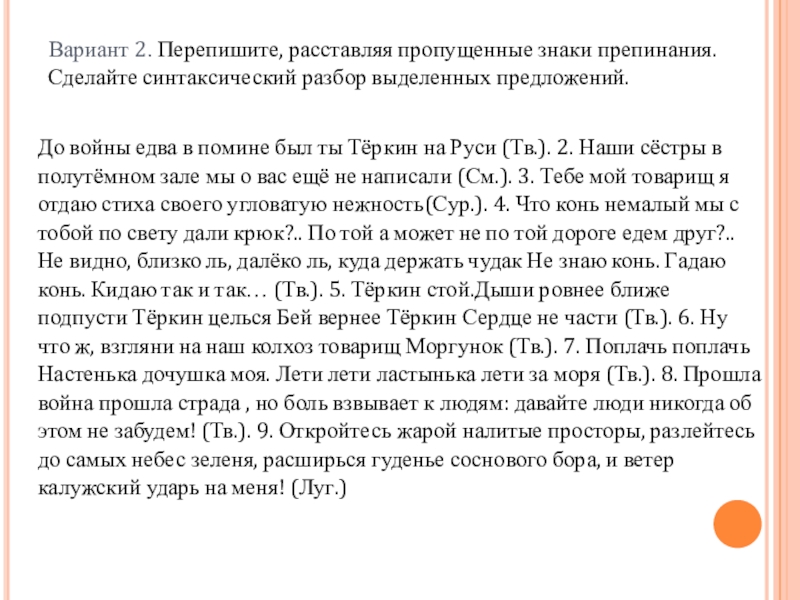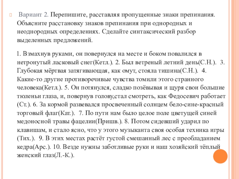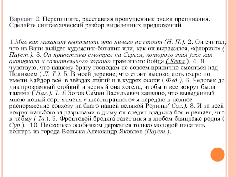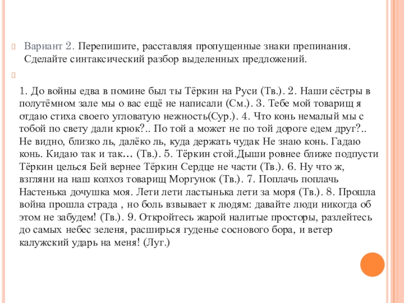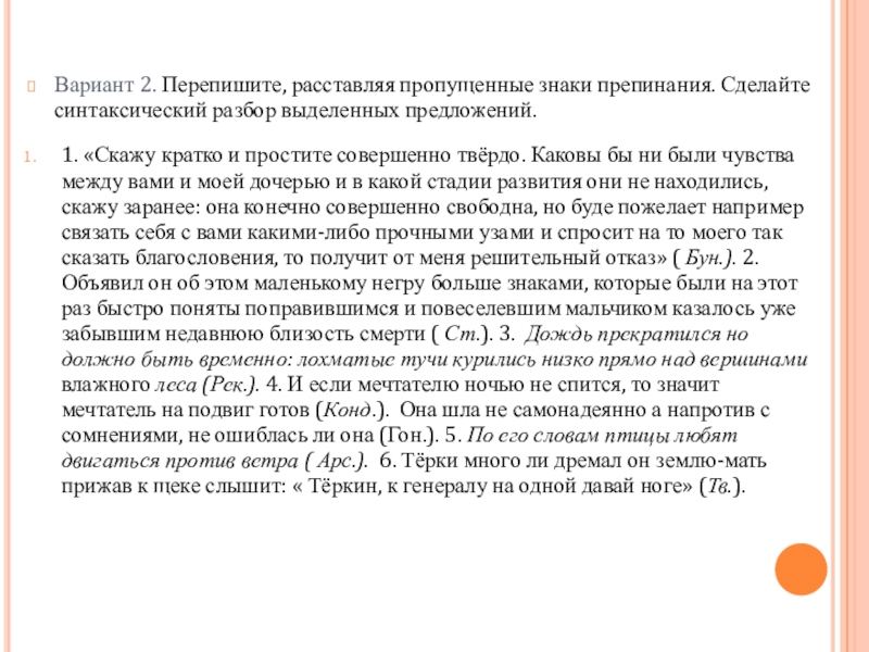 Слайд 65Вариант 2. Перепишите, расставляя пропущенные знаки препинания. Сделайте синтаксический разбор выделенных